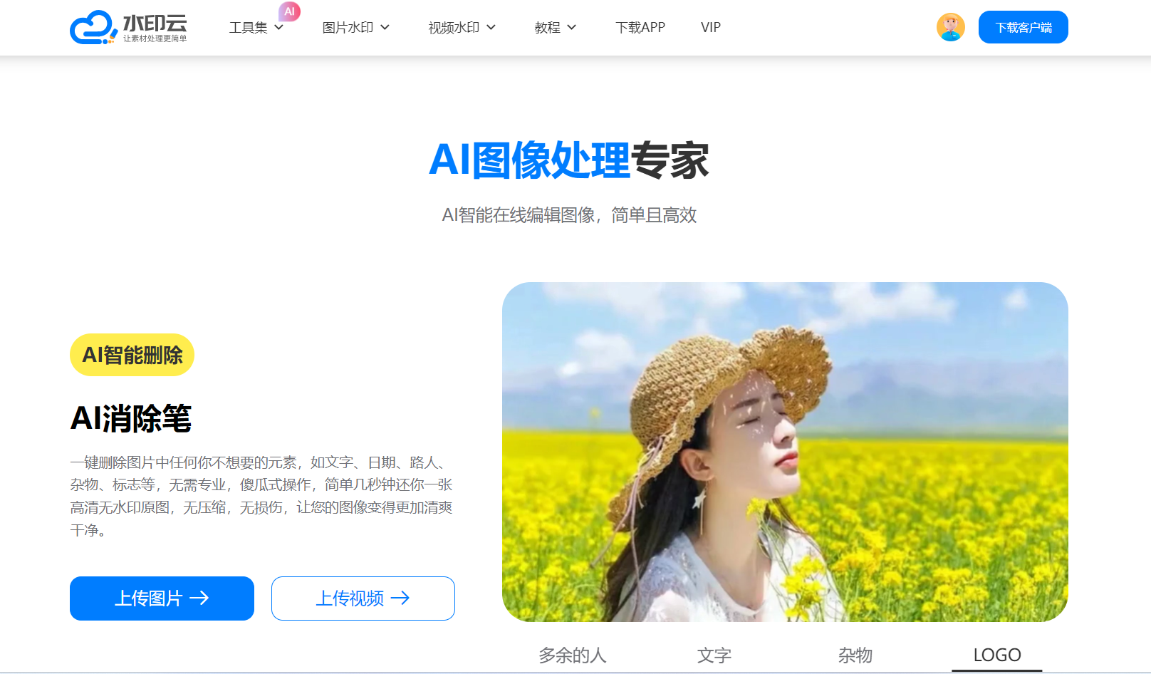 第一步:打开水印云的官网,点击进入【AI消除笔】将水印图片进行上传,支持等多种图片格式(JPG、JPEG、PNG、BMP)等上传。