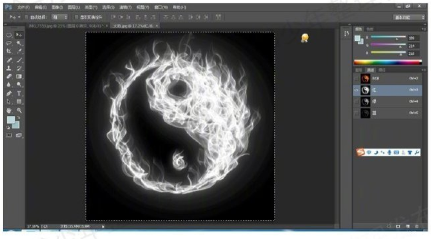 火焰抠不出来,怎么办?我们可以用黑白选区。哪里找黑白选区?通道!哪个黑白明显,我们就用什么通道;CtrI+a,Ctrl+c,复制通道。