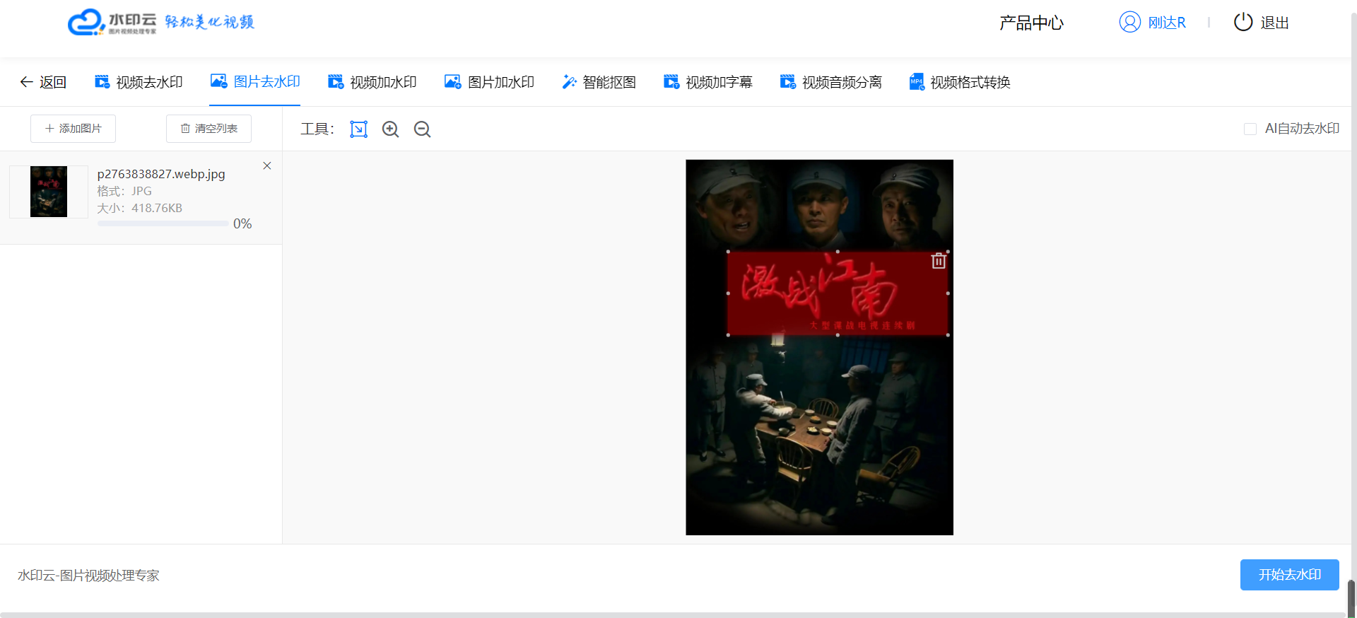 打开水印云,点击图片去水印,选择要去水印的照片,点击开始上传;