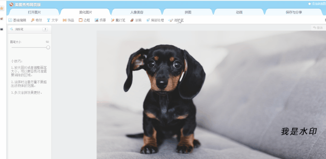 1.如果你的电脑既不是Win10系统,又没有安装PS,那么可以通过「美图秀秀网页版」,也能去掉图片上的水印,无需安装,即可在线去水印!