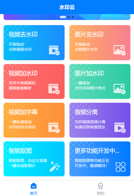 如果你的水印是人为添加的水印或者视频已经保存到手机里去了,那么也可以使用水印云这个APP,我们不仅可以在线解析去短视频水印,还可以去除手机相册里的图片和视频的水印,甚至还可以进行加水印印,简直太逆天了吧!