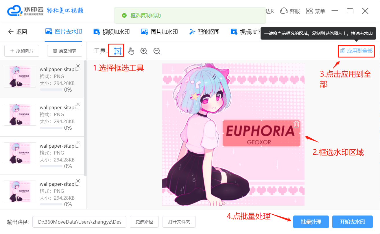 而水印云批量去除水印也是同样的操作步骤,批量导入文件后,选中想要消除的水印位置,点击开始处理按钮即可轻松去除水印。