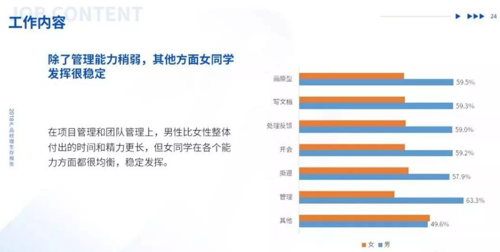 在项目管理和团队管理上,男性比女性整体付出的时间和精力更长,但女同学在各个能力方面都很均衡,稳定发挥。