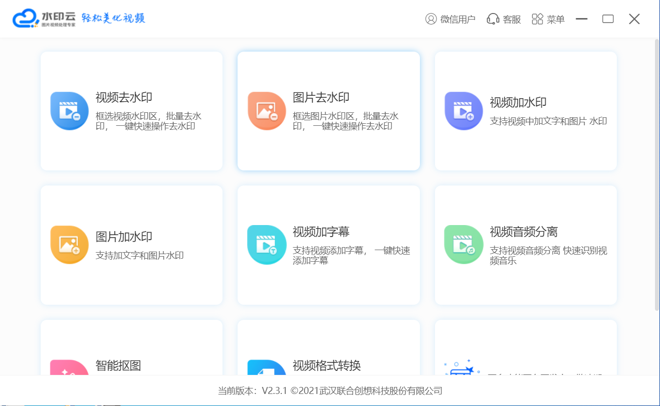 1.打开软件我们可以看到很多功能,我们选择图片去水印功能。