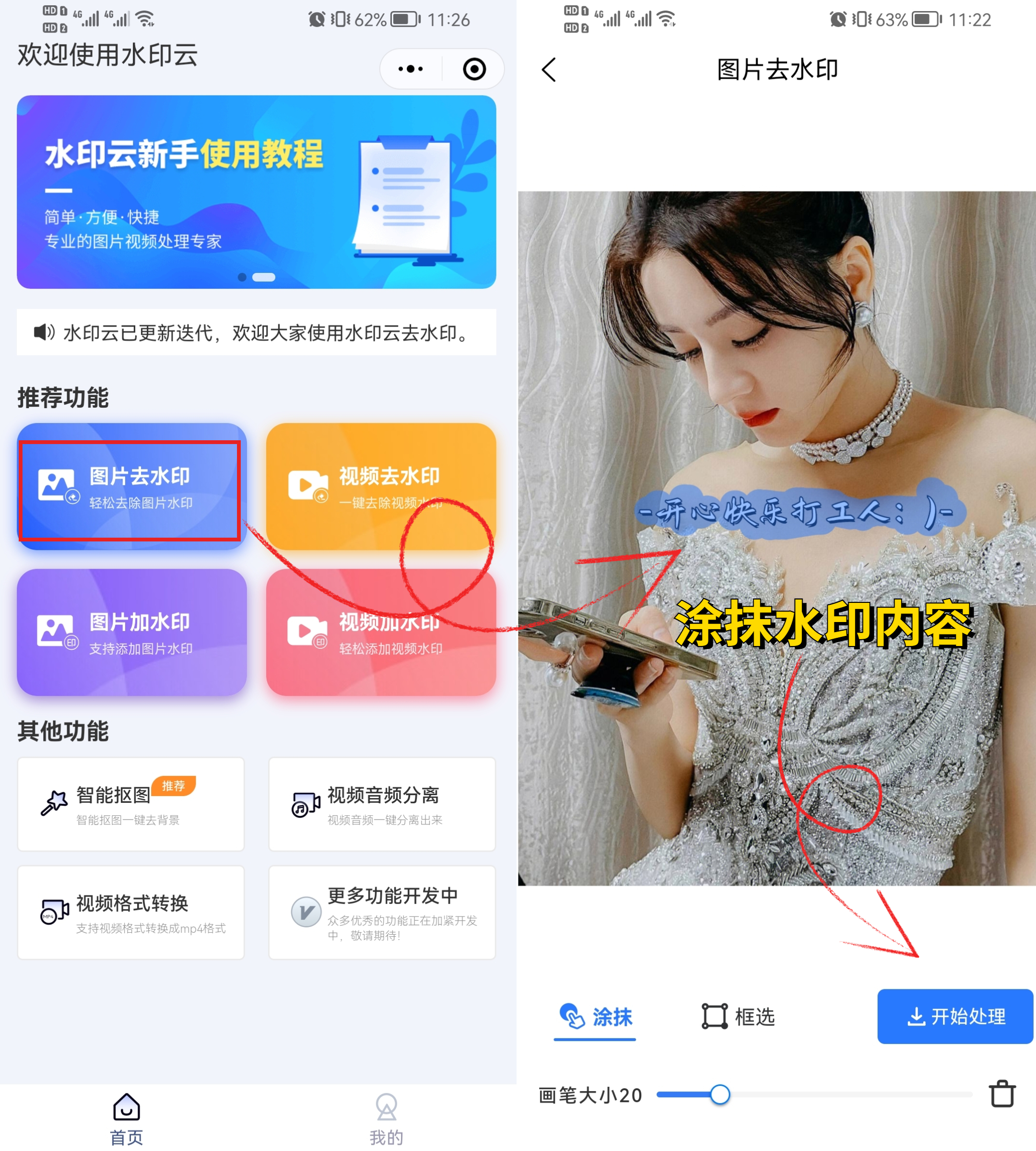 ② 进入功能主页,除了核心功能外没有其他多余元素,将相册中的水印图片上传后,跳转画笔大小并将水印内容进行涂抹覆盖。