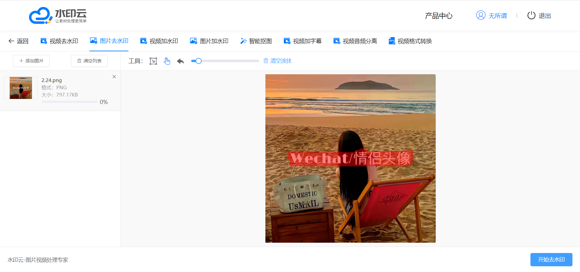 上面已经分别对如何去除文字、标志以及物体水印做了详细的介绍,我们再来快速分享一下通过【水印云】在线体验如何去水印的具体步骤: