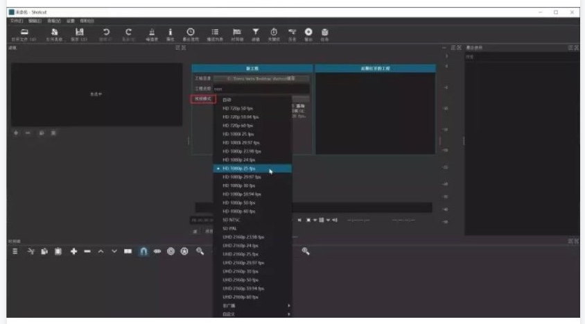 在Shotcut新建项目时,需要先设置视频模式,即设置视频的尺寸和帧率,HD代表高清,UHD代表超高清。