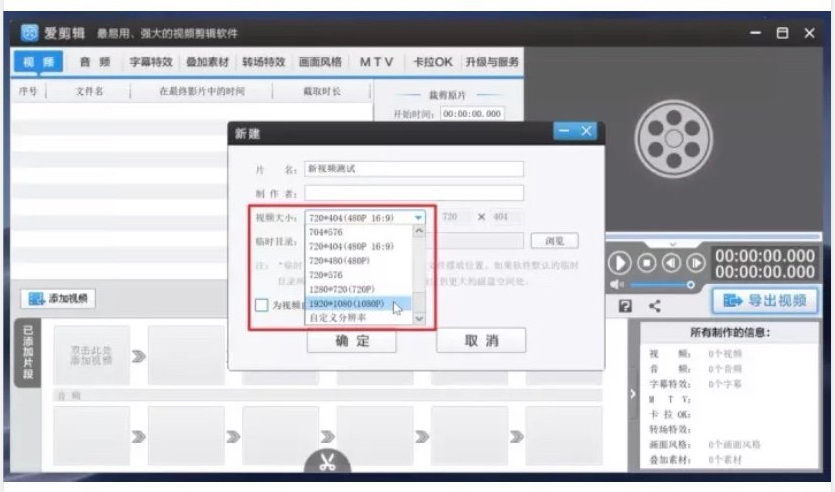 每次打开爱剪辑,需要先设置视频的大小,一般设置为720p或1080p,且上方的制作者为必填项,因为最终导出的视频片头会包含制作者的名称。