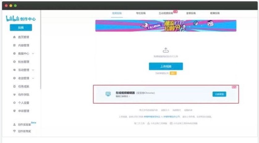 这是B站推出的在线视频编辑器,无需下载或安装软件,有Chrome浏览器就可以使用,你可以在创作中心的视频投稿页面找到它。