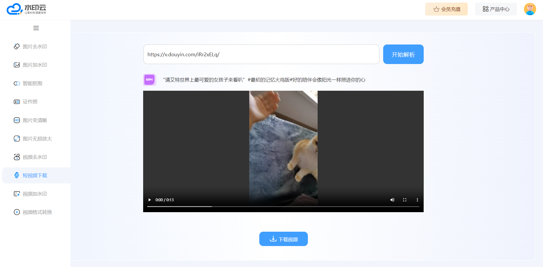 在水印云中还有一个神奇的功能“视频/图集下载”可以通过这个功能直接下载到无平台水印的视频,通过打开水印云的小程序或访问其网页端选择“视频/图集下载”,用户可以轻松粘贴短视频分享链接,进行解析,并在解析完成后一键下载,方便保存并欣赏喜欢的视频内容。
