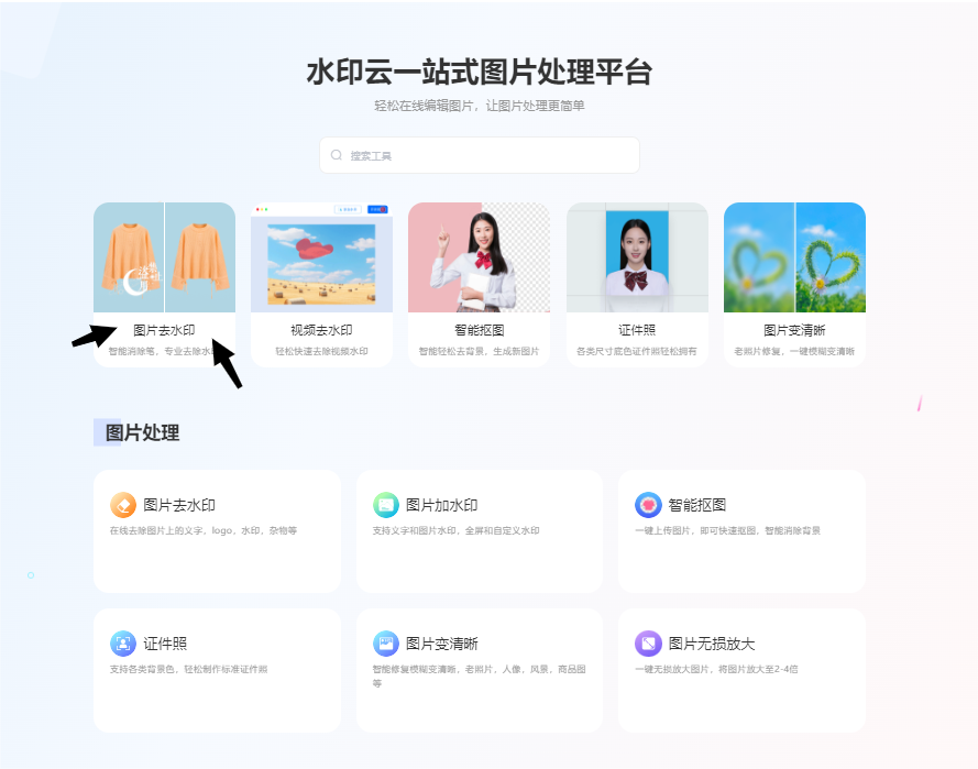 1:搜索水印云进入官网,找到【图片去水印】功能。