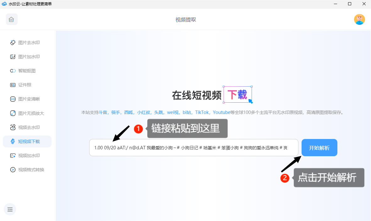 最后,将视频链接粘贴到上方的空白框中,点击“开始解析”,只需要几秒钟就完成啦!