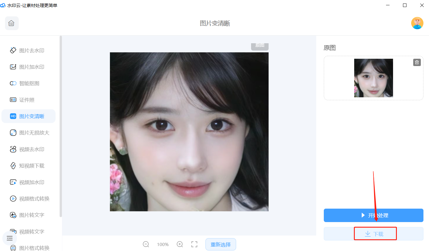 水印云采用了先进的AI图像增强技术,可以自动识别并修复模糊的图片,使其变得更加清晰。操作步骤为:
