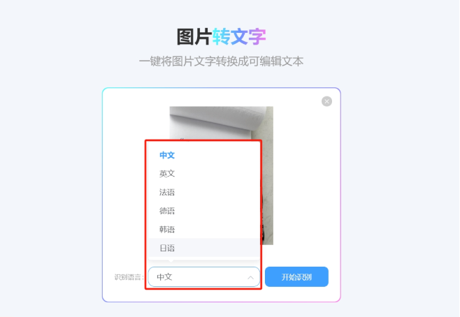 • 图片上传成功后,选择识别语言,接着点击“开始识别”按钮;