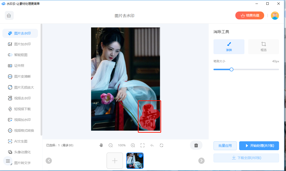 开始去水印:涂抹完成后,点击“开始去水印”按钮,等待几秒钟即可看到处理效果。水印云利用AI技术智能分析并去除水印,同时保留图片原有画质,确保处理后的图片清晰、自然。