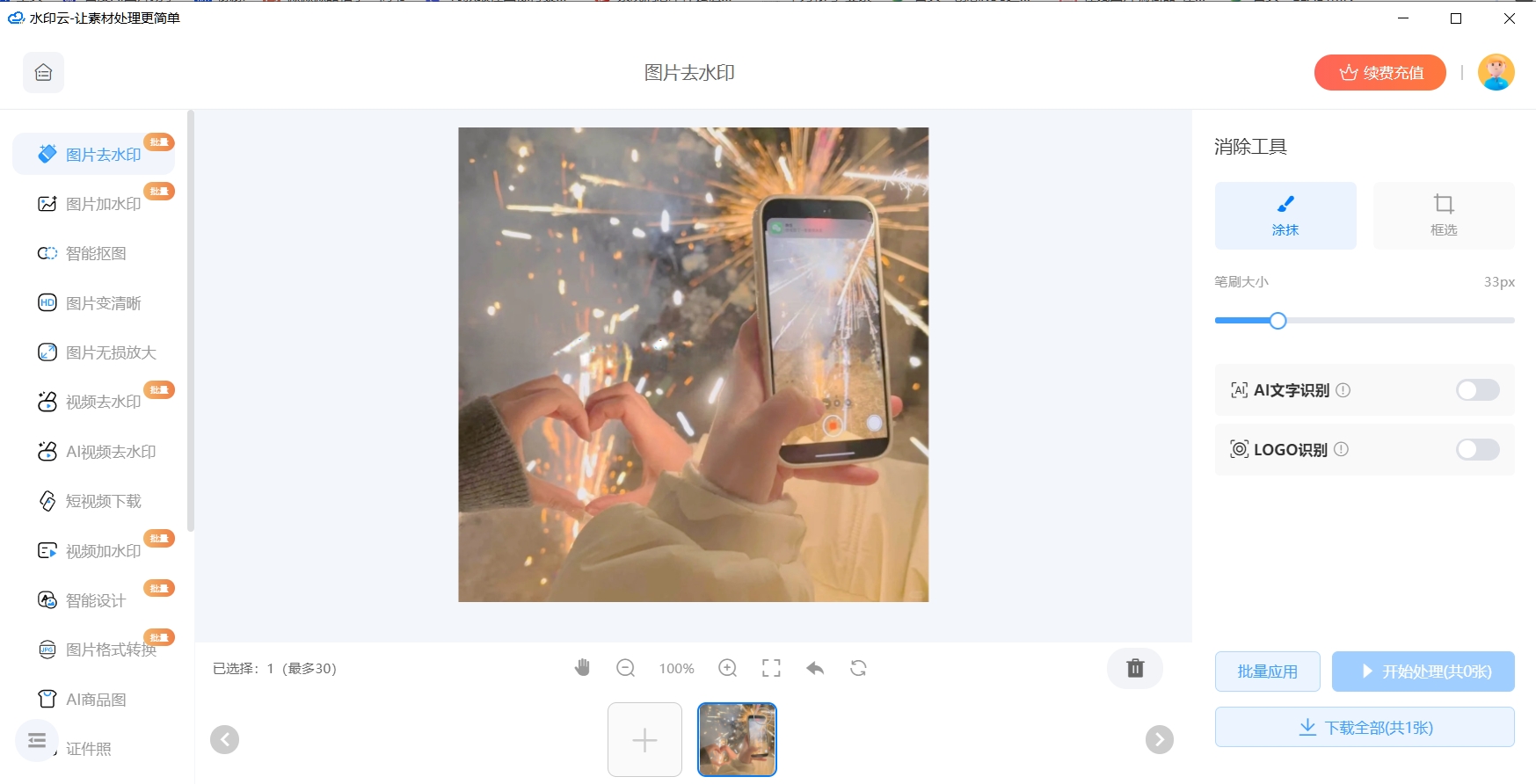 水印云集合了图片去水印、视频去水印、抠图、视频转文字、证件照制作、画质修复以及AI绘画等多种图片处理功能。