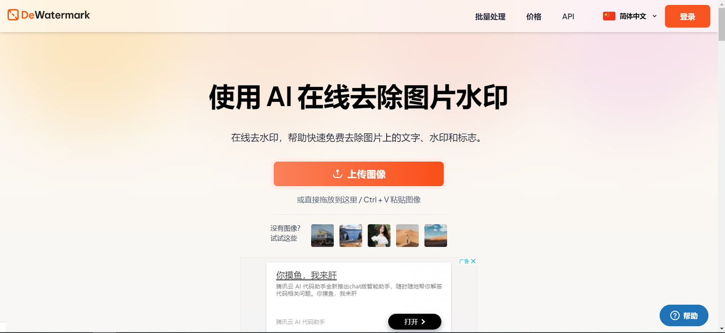 DeWatermark 是一个专注于去除图片文字水印的宝藏网站。它借助先进的 AI 技术,高效去除水印,尤其擅长对付全屏文字水印,而且完全免费,没有任何充值入口,简直太良心了。