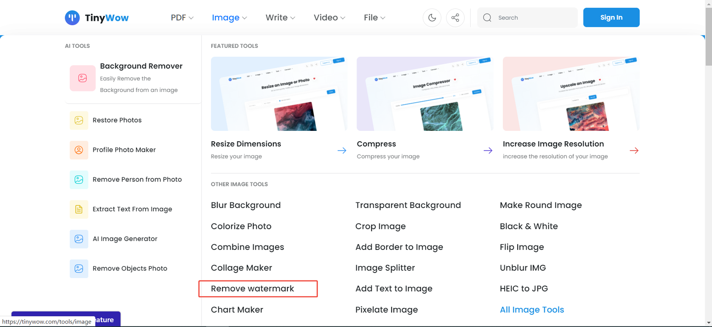 1、访问 TinyWow 官网,点击 “remove watermark” 功能。