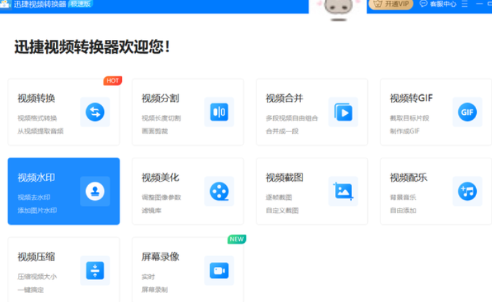 我们在视频转换器的首页中,首先要找到的是能够去除视频水印的操作位置是在哪,那它在哪儿呢?就在视频转换器的第二行选择“视频水印”。大家点击视频水印进入到它相应的操作界面进行下面的水印去除操作!