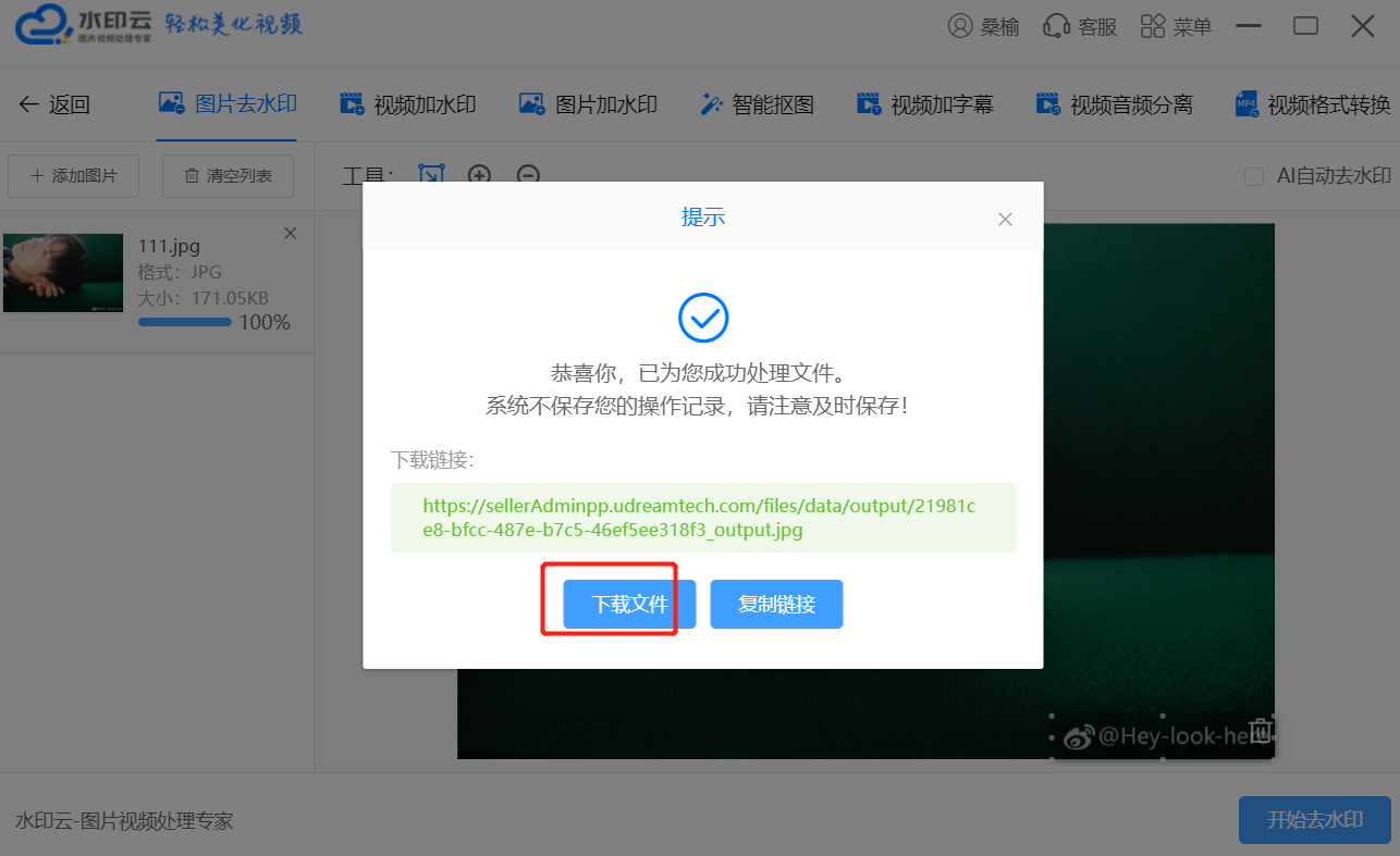 5、水印去除后,点击“下载文件”,这时候会跳出去水印的图片提前预览,可以右键鼠标另存为即可。