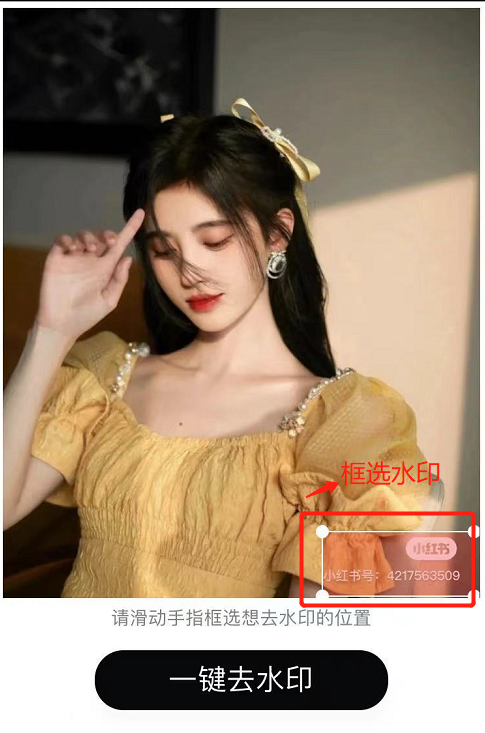 2、上传图片,再框选水印,点击“一键去水印”,再保存至手机相册即可