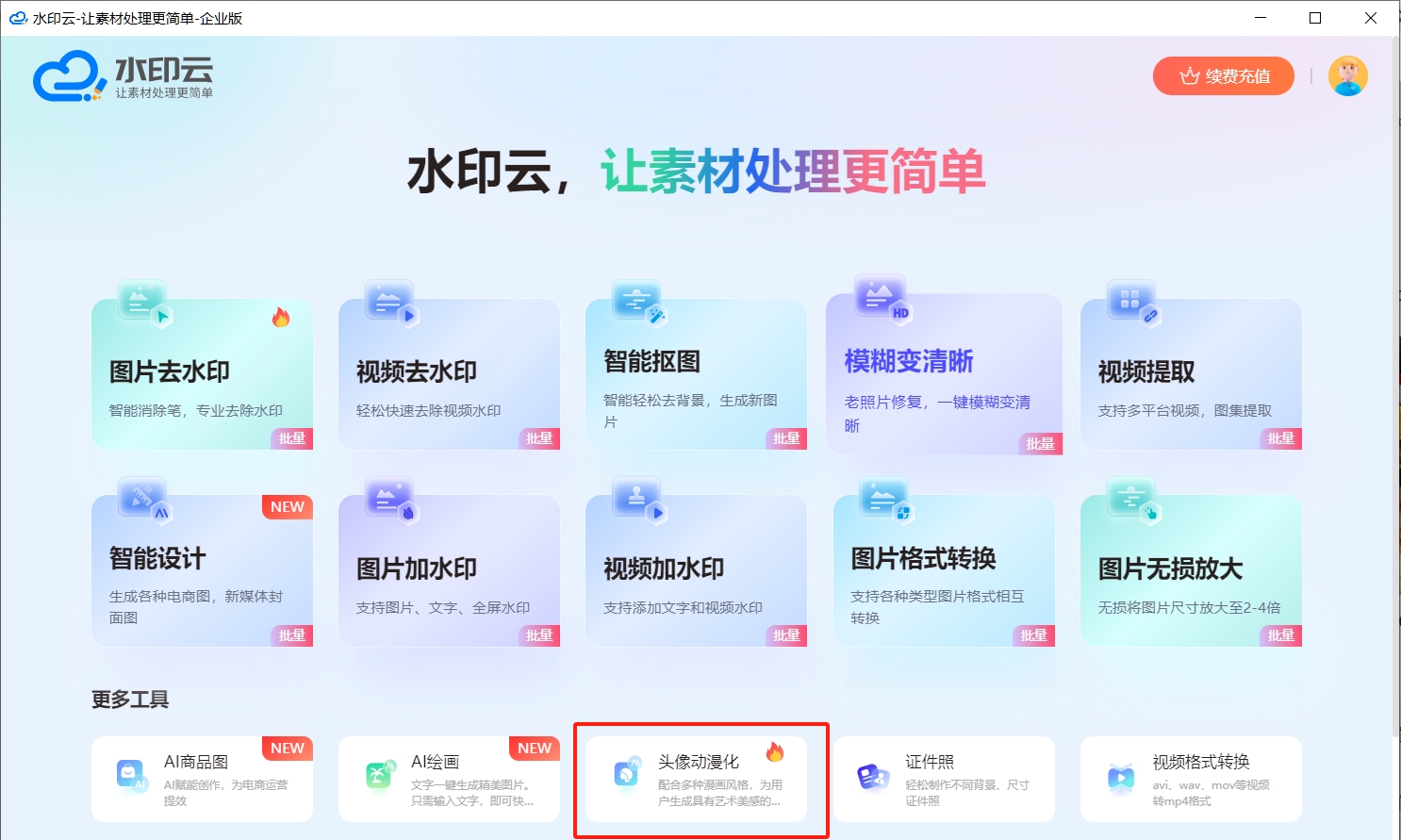 一款集图片去水印,AI抠图,真人转漫画等功能于一体的AI图像处理神器,其中头像动漫化里包含多张当前流行的风格,例如日系动漫,古风,3D,卡通,黏土等,一键生成。