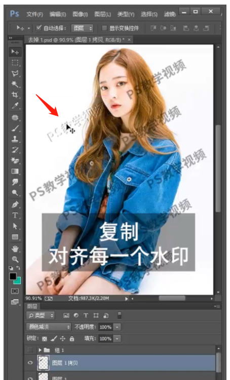 5、按alt+鼠标拖拽,复制多个,对齐覆盖每一个水印。